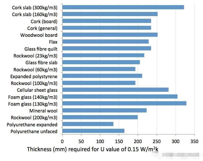 因为不同的保温材料导热系数不一样,达到相同的保温效果下,厚度也会不一样。展示给大家的第一个图片,是达到0.15W/(m2.K)下,不同保温材料的厚度情况。这里假设了一种环境,即除了保温材料不一样,其他的基层构造都一样。
